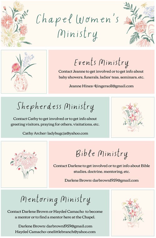 - Bible Studies - Bible studies are used to deepen women’s understanding of God’s Word so they continually grow in their personal relationship with Jesus Christ. Bible studies are overseen by the Ministry Teacher and all Bible study literature is approved by both the Ministry Teacher and a member of the Council of Elders.