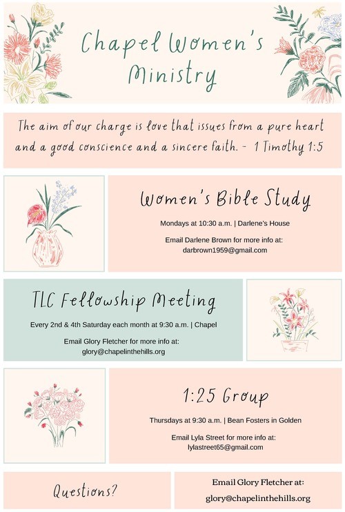 - Events - Ministry sponsored events are excellent opportunities for fellowship with Chapel women. Examples of events include: an annual Christmas tea, craft days, retreats, community outreach, lunch get-togethers, prayer groups, themed dinners, social outings, and other activities.